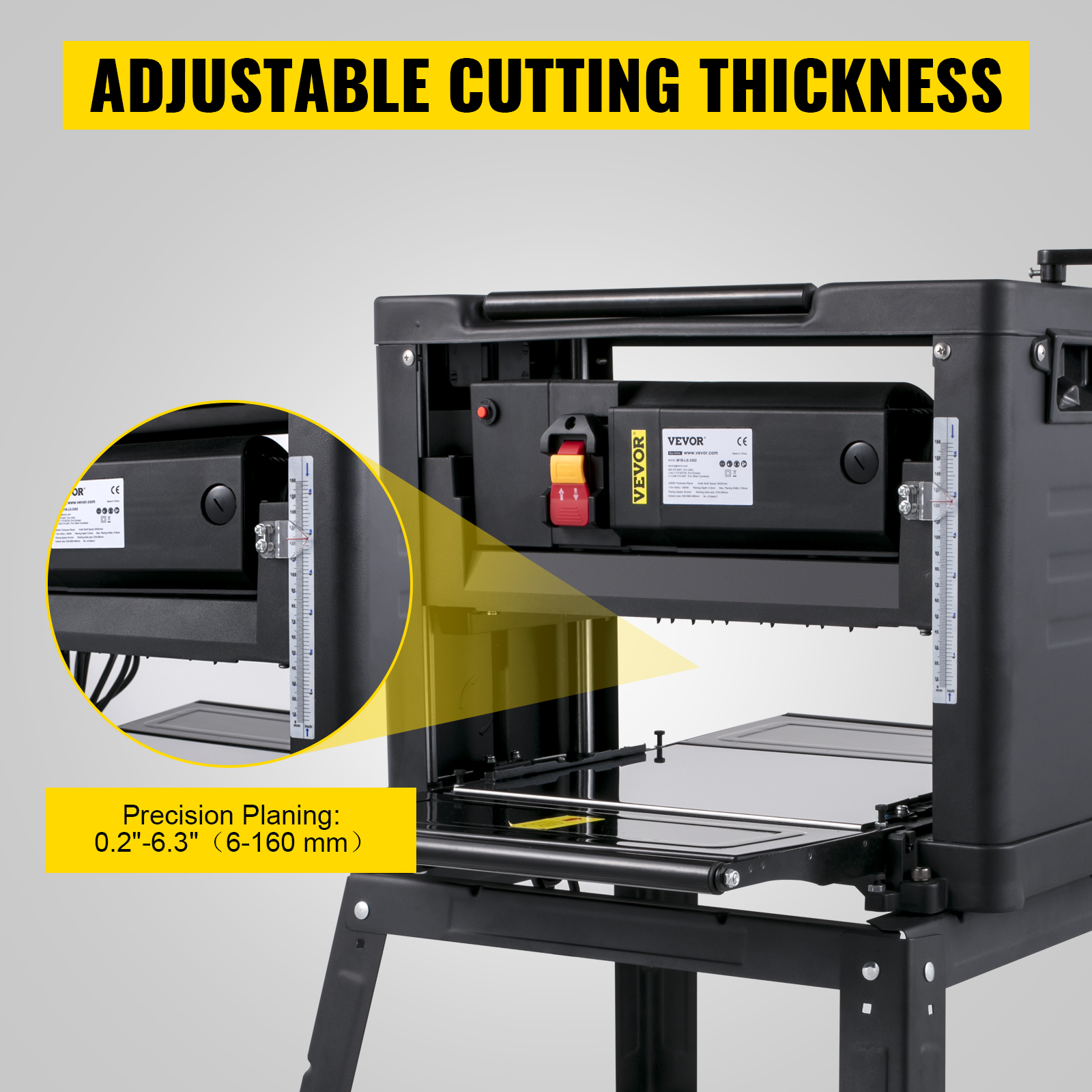 - Tabelle di Ingresso e Uscita: larghezza di taglio massima: 13″ (330 mm); Spessore di taglio: 0,2″-6,3″ (6-160 mm). Il banco da lavoro interamente in acciaio inossidabile e materiale metallico può garantire una procedura di lavorazione del legno regolare e stabile. La lama in HSS non è facile da rompere, prolungando la durata di circa il 10% in più rispetto ad altre.Una manovella per una facile regolazione dell’altezza della testa di taglio;Un righello di scala per una lavorazione precisa;Un design di alimentazione automatica è disponibile per l’alimentazione automatica del materiali; 2 rulli di ritorno in metallo sono forniti per far tornare indietro i pezzi senza sforzo.