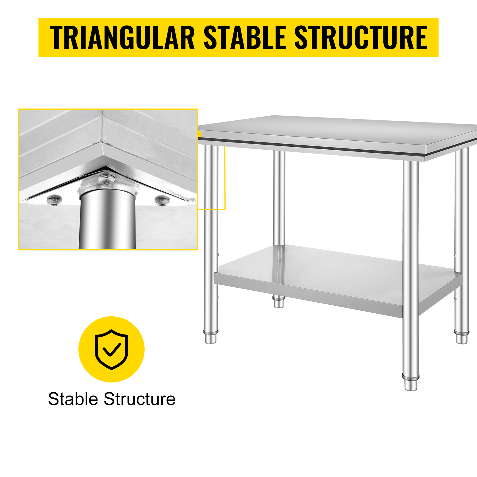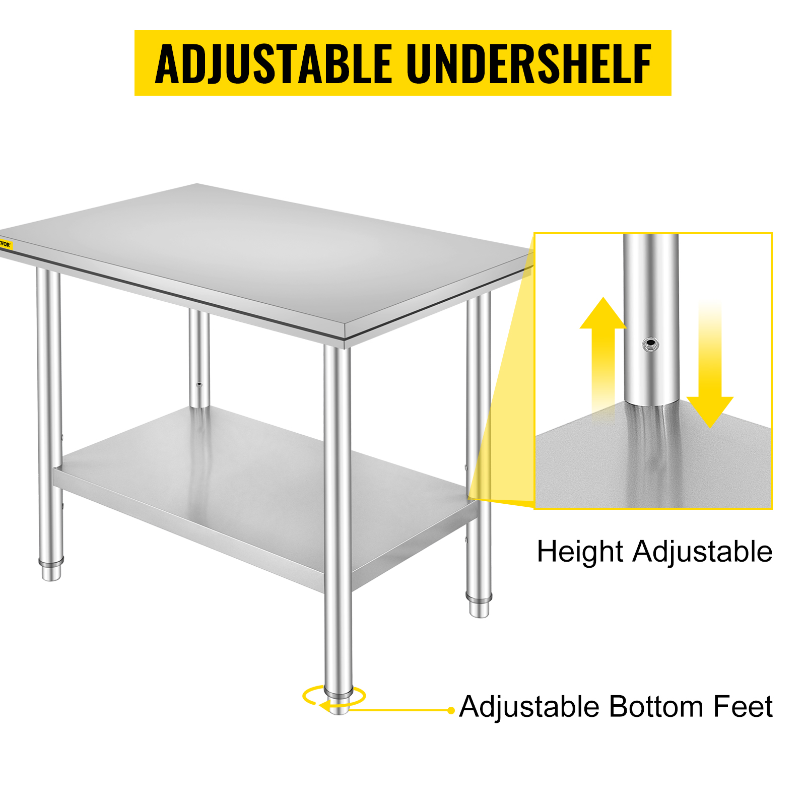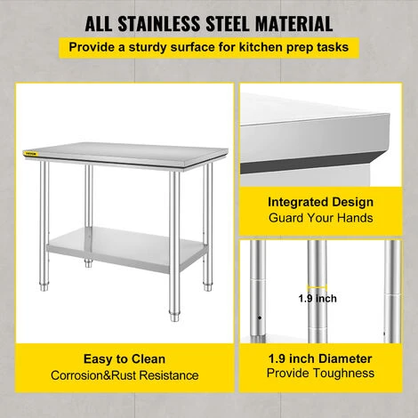 Tavolo da lavoro commerciale superiore. Costruito da acciaio inossidabile non magnetico durevole, resistente alla corrosione e all’usura, non si deforma facilmente senza problemi, disordine o contaminazione. Si può facilmente cambiare l’altezza ruotando i piedini, perfetto per la cucina, il ristorante, la scuola e qualsiasi altra applicazione domestica o commerciale.