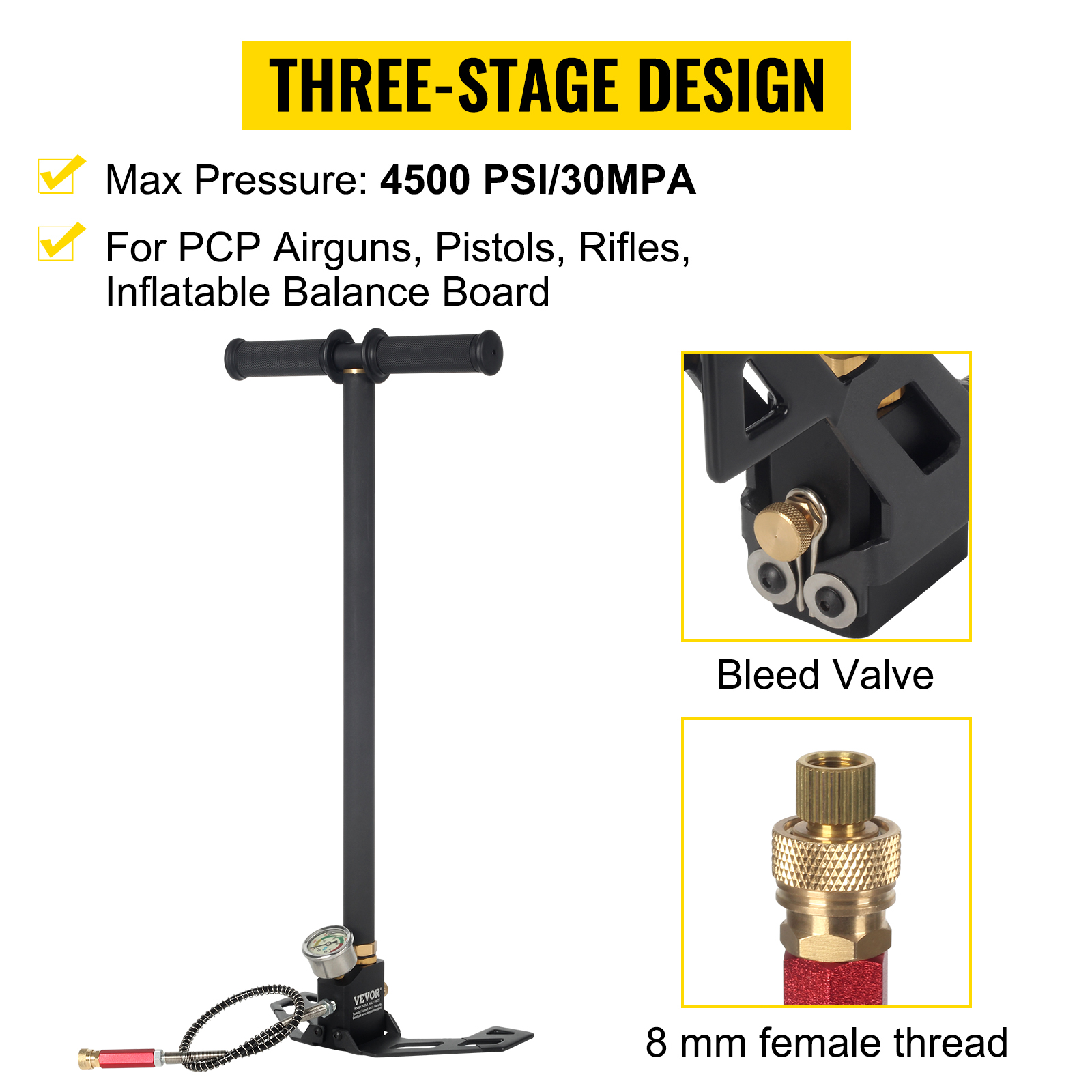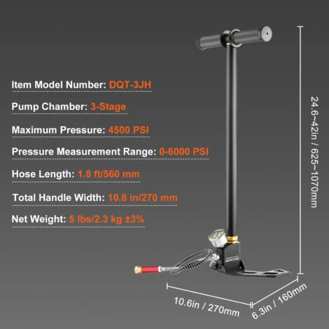 L’ultima pompa a staffa di design costruita con acciaio inossidabile 301 di alta qualità e il corpo della pompa è più sicuro dell’acciaio inossidabile 304, design a 3 stadi, il 30% più efficiente delle pompe tradizionali ed è ideale per riempire le popolari pistole ad aria compressa PCP. Il tubo in dotazione possiede un connettore rapido con filettatura femmina da 8 mm, nessun adattatore di riempimento specifico per la pistola fornito.