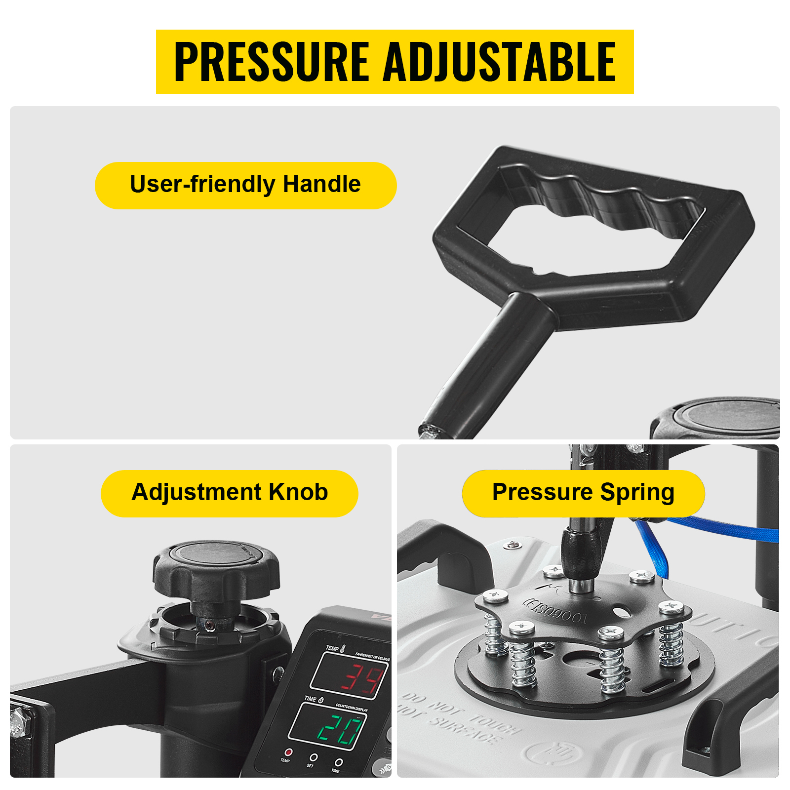 La manopola di regolazione e il sistema a molla applicano facilmente la pressione richiesta in base allo spessore del materiale da trasferire. Distribuito in modo più uniforme sulla piastra pressa per camicie.
