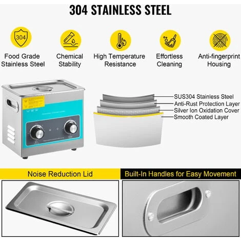 Questo pulitore di parti a ultrasuoni è realizzato in acciaio inossidabile 304 con un coperchio per la riduzione del rumore e maniglie incorporate su entrambi i lati, progettato per un uso durevole e una facile pulizia.