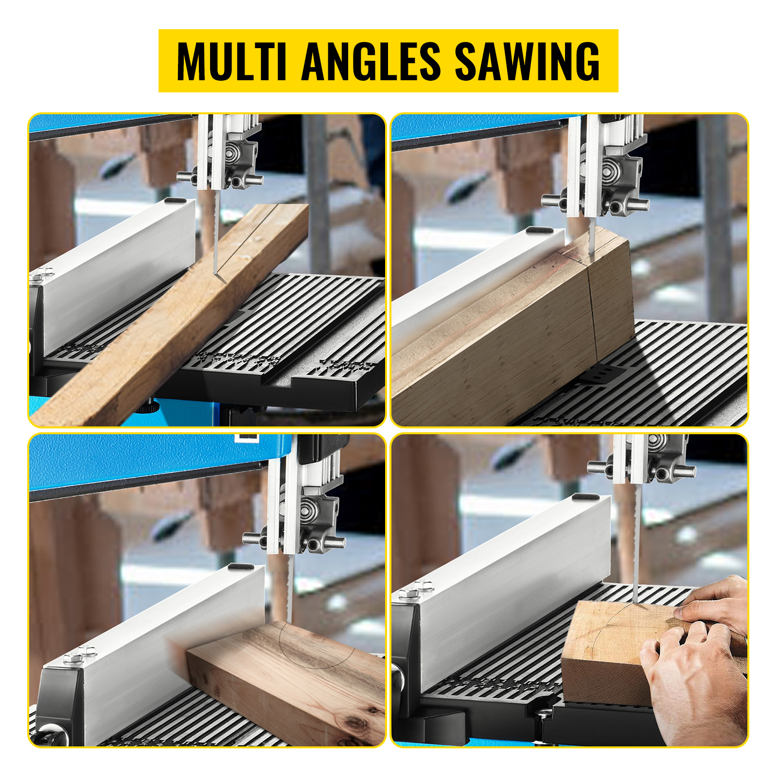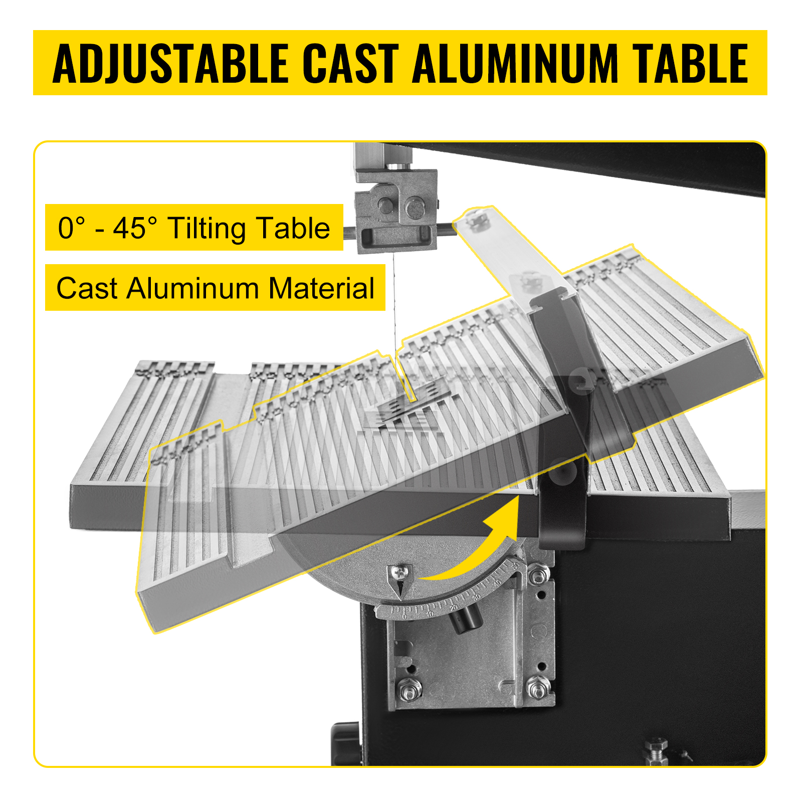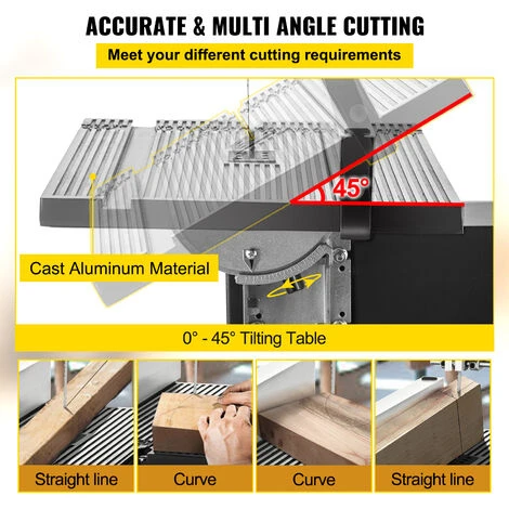 - 0 – 45° Tavolo da Taglio Robusto: Le seghe a nastro per legno hanno un robusto tavolo in alluminio pressofuso che misura 11,8 x 11,8 pollici (300 x 300 mm), fornendo una superficie di lavoro ampia e robusta. La manopola di regolazione dell’inclinazione del tavolo può inclinare rapidamente il tavolo fino a 45° per un taglio inclinato preciso.