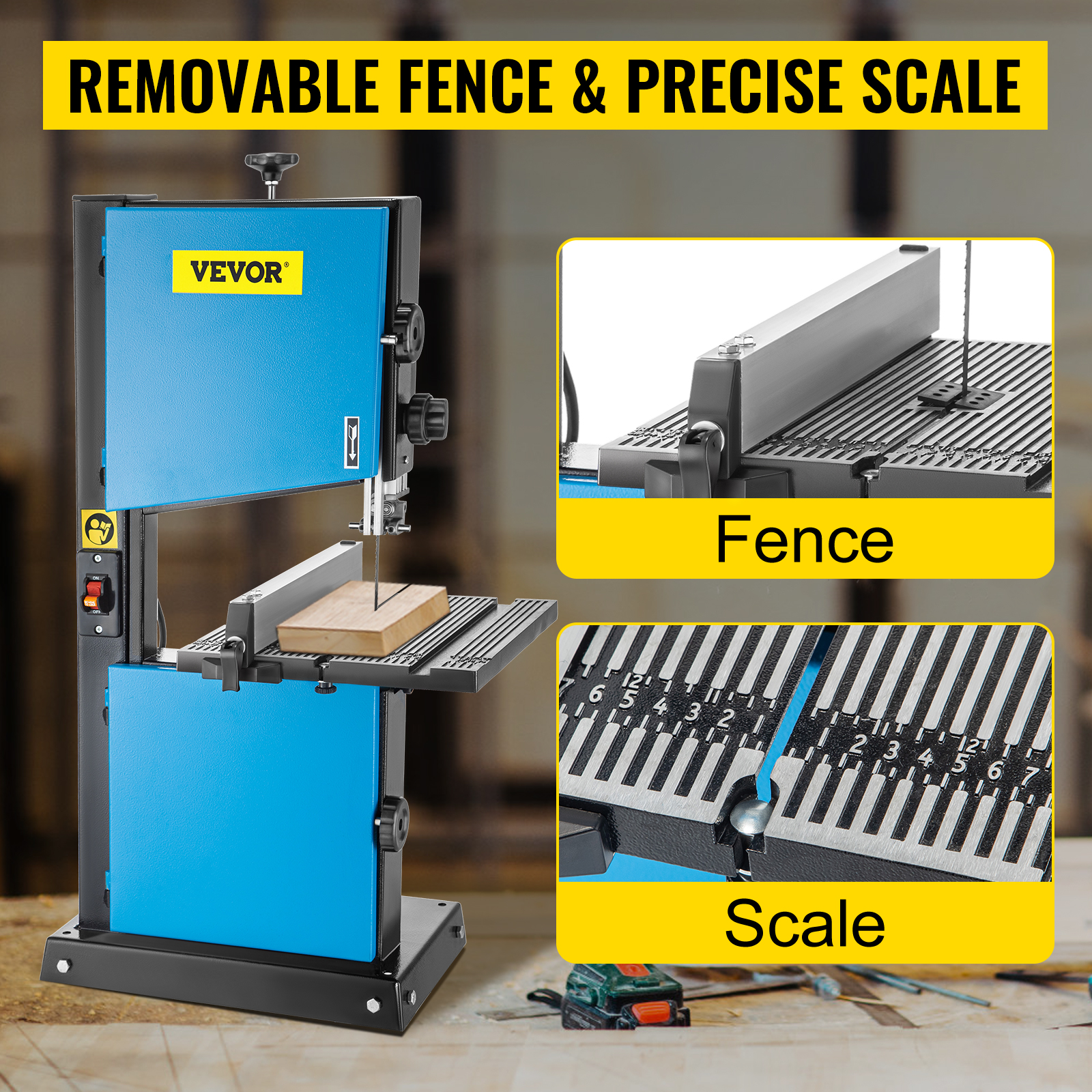 La sega a nastro per legno è dotata di una staccionata e di una bilancia precisa. La guida è progettata per creare tagli dritti e la scala sul tavolo può essere utilizzata per tagliare con maggiore precisione.