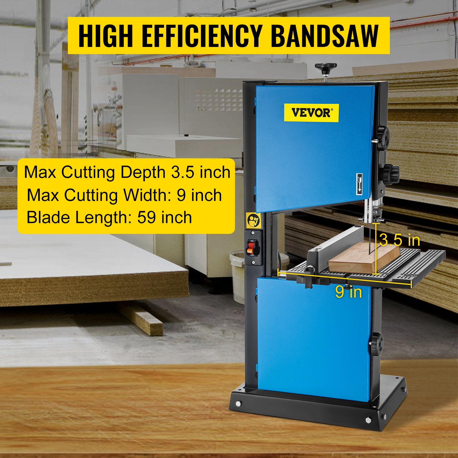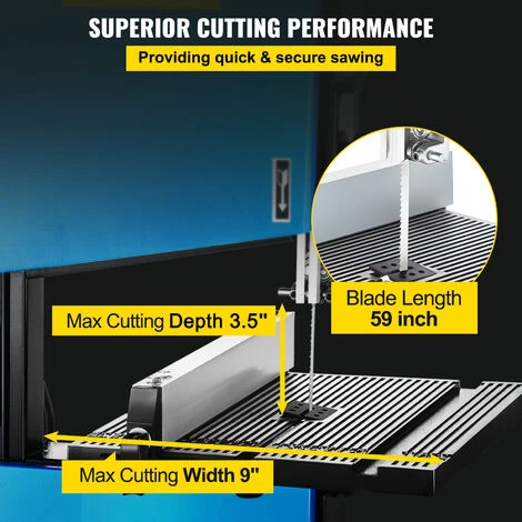 - Capacità di Taglio Superiore: La nostra sega a nastro da banco, dotata di una lama da 59 pollici di lunghezza, presenta una profondità di taglio massima di 90 mm e una larghezza di taglio massima di 229 mm. La manopola di tensione della lama sulla sega a nastro può regolare due velocità per soddisfare la tua maggiore precisione.