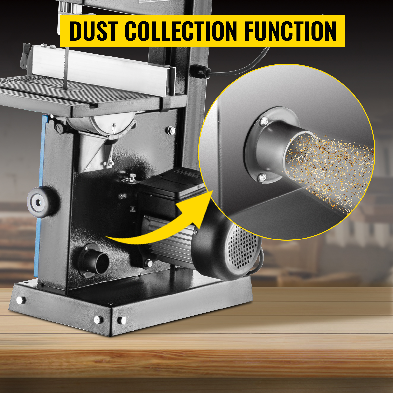 - Efficiente Porta per la Segatura: La sega a nastro include una porta per la polvere progettata per un funzionamento senza polvere. La porta può accettare un tubo di aspirazione. Pertanto, la nostra sega a nastro aiuta a ridurre al minimo la polvere e i detriti nell’area di lavoro, riducendo l’inquinamento.