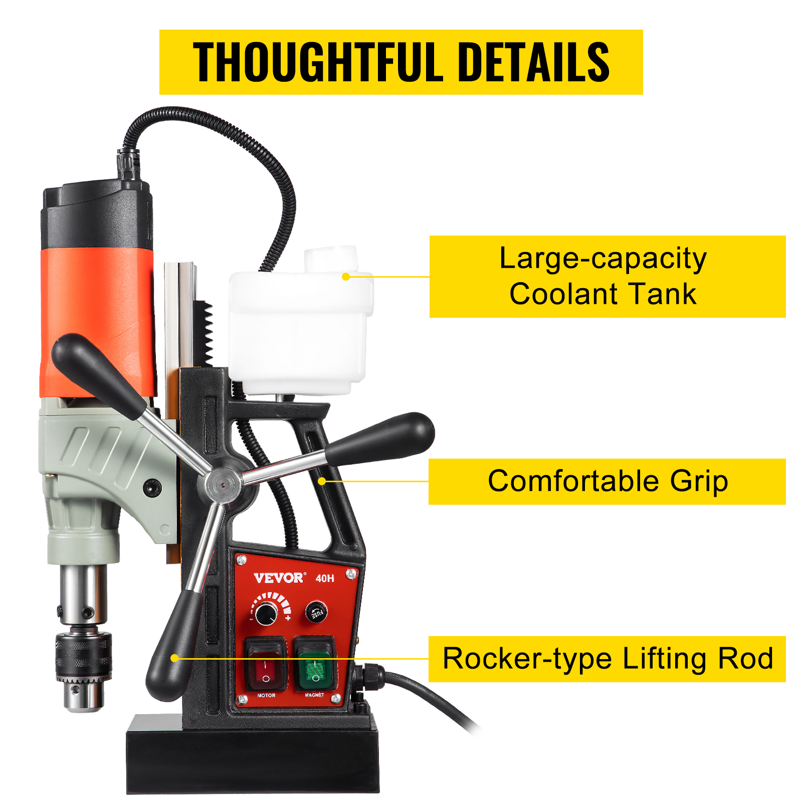 - Doppia Guida a Coda di Rondine: La doppia guida a coda di rondine può regolare l’altezza del motore per ottenere un max. distanza di viaggio: 6,30 “/160 mm. Entrambi i lati del trapano magnetico possono essere installati con 3 manovelle estese per aggiungere la tua comodità. Il serbatoio del liquido di raffreddamento viene utilizzato per una rapida dissipazione del calore.