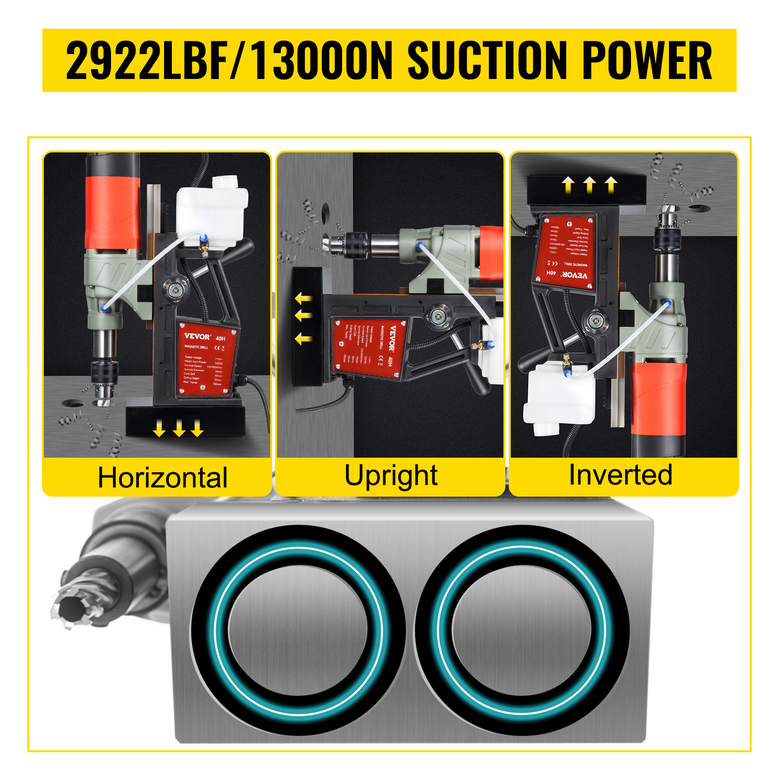 La base in ferro quasi puro fissa saldamente il trapano avvitatore magnetico durante il lavoro come un potente elettromagnete con una forza di 2922 libbre (13.000 N), impedendo il movimento durante il processo di perforazione.