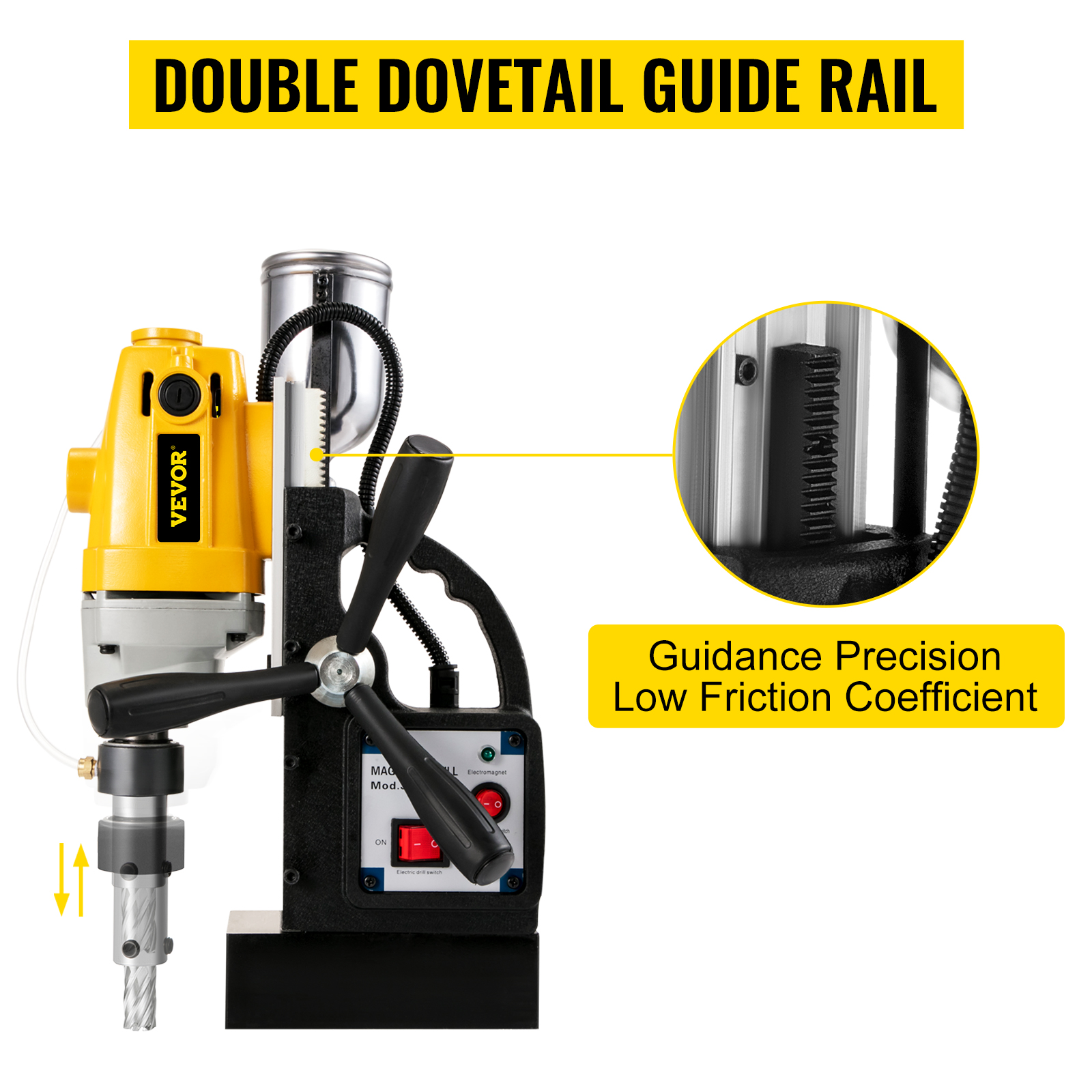 La resistenza all’usura di questa doppia guida a coda di rondine è migliore di quella delle normali guide, aumenta la rigidità e migliora la resistenza all’usura del trapano magnetico.