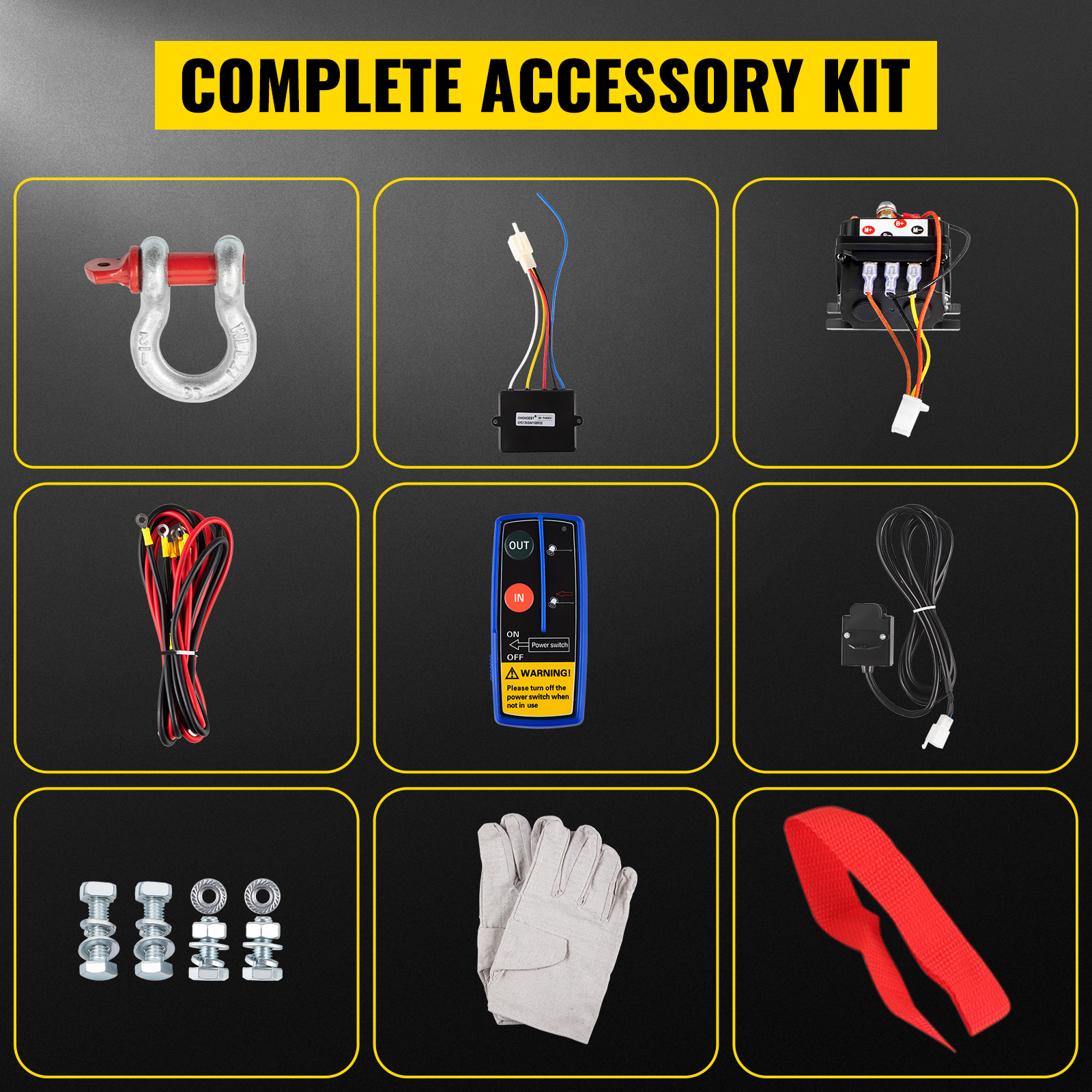 - Altri Accessori Forniti: accessori completi per verricello: 1 x verricello elettrico, passacavo a rulli a 4 vie, 1 x telecomando wireless, 1 x telecomando cablato, 1 x piastra di montaggio, 1 x gancio, 1 x grillo, 1 x set di bulloni. Il verricello di traino è realizzato in alluminio resistente per garantire resistenza e durata.