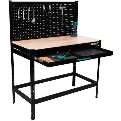 VONROC Banco da lavoro 115 x 56 x 145 cm. Capacità di carico 130kg. Con cassetto e parete forata in acciaio. Incl. Set di 15 ganci