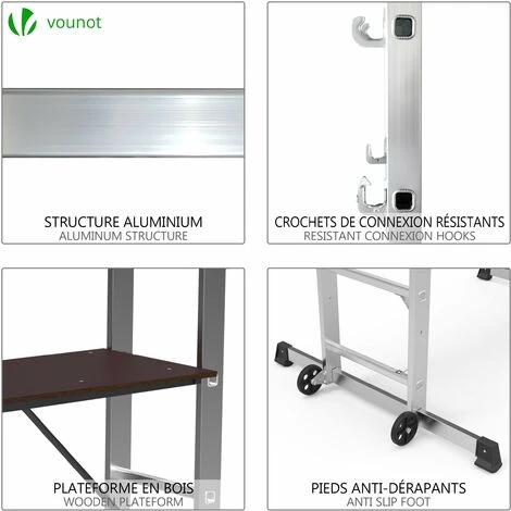 Il nostro Vounot ti offre una gamma di prodotti pratici per la casa e il giardino al miglior rapporto qualità-prezzo. Il nostro marchio Vounot è registrato presso l’INPI e sebbene sia ancora giovane, i nostri team hanno 15 anni di esperienza in Francia con i grandi prodotti per la casa e il giardino che hanno fornito nel corso degli anni. Trabattello in alluminio 3 in 1 con piattaforma di lavoro I nostri trabattelli in alluminio possono garantire la migliore stabilità e possono caricare un massimo di 150 kg. L’altezza regolabile del ponteggio rende questo ponteggio molto pratico per qualsiasi lavoro in quota. Nota importante: Le consegne vengono effettuate in Metropolitan ad eccezione delle isole che non sono collegate al continente da un ponte (Corsica, Ile d’Yeux, ecc.). La consegna non avviene nel DOM-TOM.