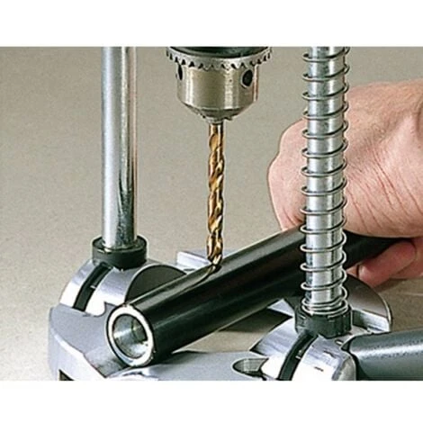 2 guide a colonna orientabili con scala per perforazione verticale, orizzontale o inclinata esatta (+ / – 45°) Arresto immediato per foratura di serie in linea Scanalatura a V integrata per il fissaggio sicuro del materiale tondo Piastra di base con dispositivo di centraggio per foratura centrale Non dovrai più cercare la punta giusta – magazzino porta punte nell’impugnatura